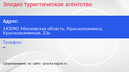 Эледиз, туристическое агентство по адресу 143090, Московская область, Краснознаменск, Краснознаменная, 23а в дальнейшем Организация, размещена в следующих категориях:
