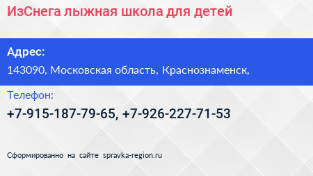 ИзСнега, лыжная школа для детей по адресу 143090, Московская область, Краснознаменск, в дальнейшем Организация, размещена в следующих категориях: