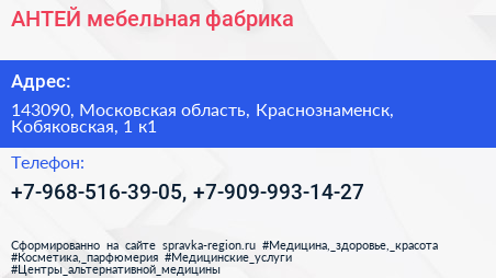 АНТЕЙ, мебельная фабрика по адресу 143090, Московская область, Краснознаменск, Кобяковская, 1 к1 в дальнейшем Организация, размещена в следующих категориях: