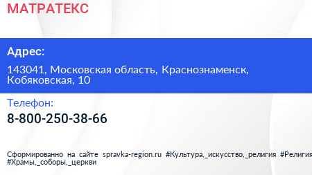 МАТРАТЕКС по адресу 143041, Московская область, Краснознаменск, Кобяковская, 10 в дальнейшем Организация, размещена в следующих категориях: