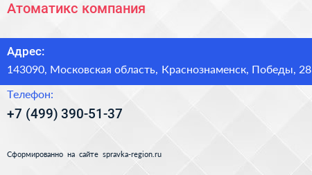 Атоматикс, компания по адресу 143090, Московская область, Краснознаменск, Победы, 28 в дальнейшем Организация, размещена в следующих категориях: