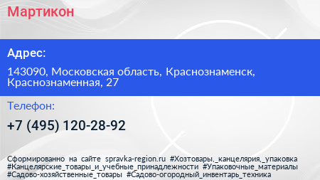 Мартикон по адресу 143090, Московская область, Краснознаменск, Краснознаменная, 27 в дальнейшем Организация, размещена в следующих категориях: