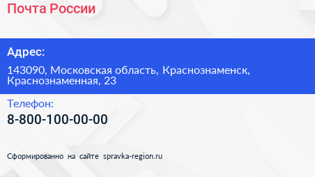 Почта России по адресу 143090, Московская область, Краснознаменск, Краснознаменная, 23 в дальнейшем Организация, размещена в следующих категориях: