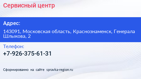 Сервисный центр по адресу 143091, Московская область, Краснознаменск, Генерала Шлыкова, 2 в дальнейшем Организация, размещена в следующих категориях: