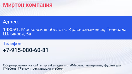 Миртон, компания по адресу 143091, Московская область, Краснознаменск, Генерала Шлыкова, 5а в дальнейшем Организация, размещена в следующих категориях: