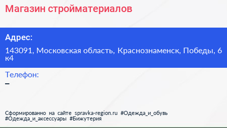 Магазин стройматериалов по адресу 143091, Московская область, Краснознаменск, Победы, 6 к4 в дальнейшем Организация, размещена в следующих категориях: