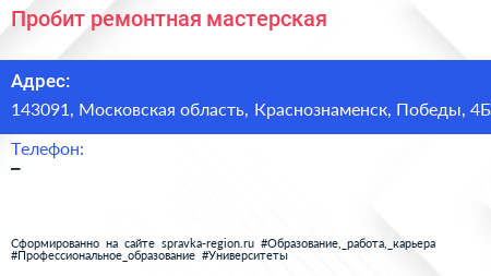 Пробит, ремонтная мастерская по адресу 143091, Московская область, Краснознаменск, Победы, 4Б в дальнейшем Организация, размещена в следующих категориях: