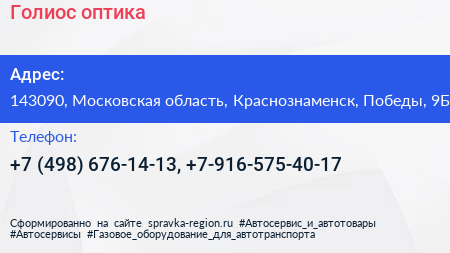 Голиос, оптика по адресу 143090, Московская область, Краснознаменск, Победы, 9Б в дальнейшем Организация, размещена в следующих категориях: