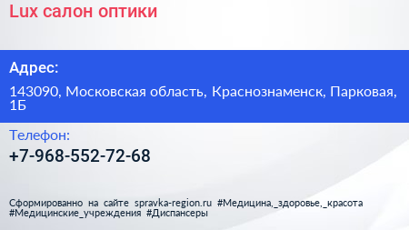 Lux, салон оптики по адресу 143090, Московская область, Краснознаменск, Парковая, 1Б в дальнейшем Организация, размещена в следующих категориях: