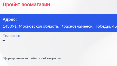 Пробит, зоомагазин по адресу 143091, Московская область, Краснознаменск, Победы, 4Б в дальнейшем Организация, размещена в следующих категориях: