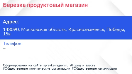 Березка, продуктовый магазин по адресу 143090, Московская область, Краснознаменск, Победы, 15а в дальнейшем Организация, размещена в следующих категориях: