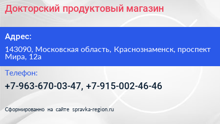 Докторский, продуктовый магазин по адресу 143090, Московская область, Краснознаменск, проспект Мира, 12а в дальнейшем Организация, размещена в следующих категориях: