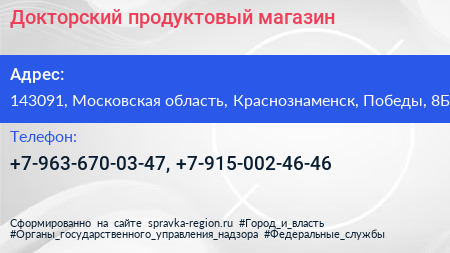 Докторский, продуктовый магазин по адресу 143091, Московская область, Краснознаменск, Победы, 8Б в дальнейшем Организация, размещена в следующих категориях: