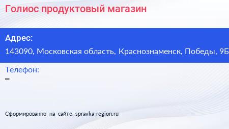 Голиос, продуктовый магазин по адресу 143090, Московская область, Краснознаменск, Победы, 9Б в дальнейшем Организация, размещена в следующих категориях: