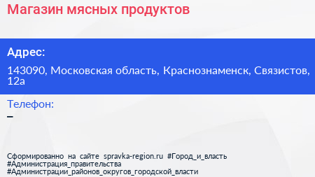 Магазин мясных продуктов по адресу 143090, Московская область, Краснознаменск, Связистов, 12а в дальнейшем Организация, размещена в следующих категориях: