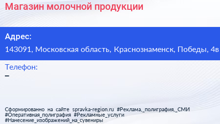 Магазин молочной продукции по адресу 143091, Московская область, Краснознаменск, Победы, 4в в дальнейшем Организация, размещена в следующих категориях: