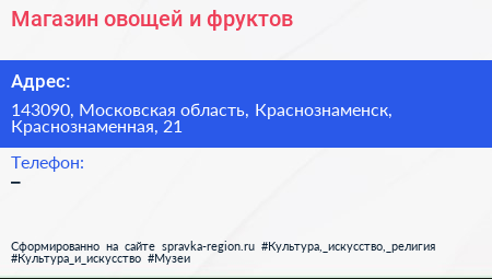 Магазин овощей и фруктов по адресу 143090, Московская область, Краснознаменск, Краснознаменная, 21 в дальнейшем Организация, размещена в следующих категориях: