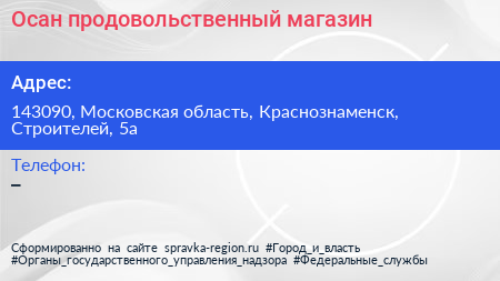 Осан, продовольственный магазин по адресу 143090, Московская область, Краснознаменск, Строителей, 5а в дальнейшем Организация, размещена в следующих категориях: