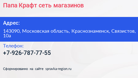 Папа Крафт, сеть магазинов по адресу 143090, Московская область, Краснознаменск, Связистов, 10а в дальнейшем Организация, размещена в следующих категориях: