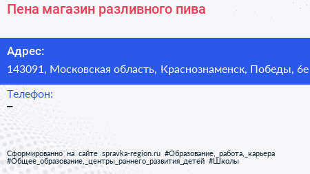 Пена, магазин разливного пива по адресу 143091, Московская область, Краснознаменск, Победы, 6е в дальнейшем Организация, размещена в следующих категориях: