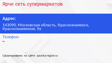 Ярче!, сеть супермаркетов по адресу 143090, Московская область, Краснознаменск, Краснознаменная, 9а в дальнейшем Организация, размещена в следующих категориях:
