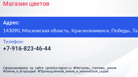 Магазин цветов по адресу 143090, Московская область, Краснознаменск, Победы, 7а в дальнейшем Организация, размещена в следующих категориях: