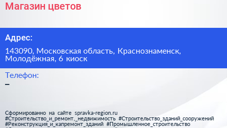 Магазин цветов по адресу 143090, Московская область, Краснознаменск, Молодёжная, 6 киоск в дальнейшем Организация, размещена в следующих категориях:
