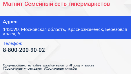 Магнит Семейный, сеть гипермаркетов по адресу 143090, Московская область, Краснознаменск, Берёзовая аллея, 5 в дальнейшем Организация, размещена в следующих категориях: