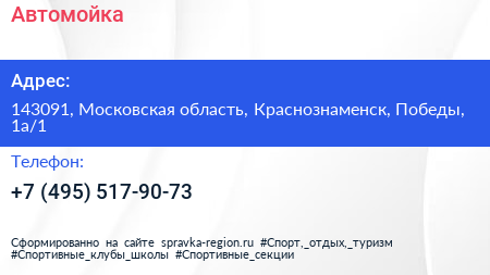Автомойка по адресу 143091, Московская область, Краснознаменск, Победы, 1а/1 в дальнейшем Организация, размещена в следующих категориях: