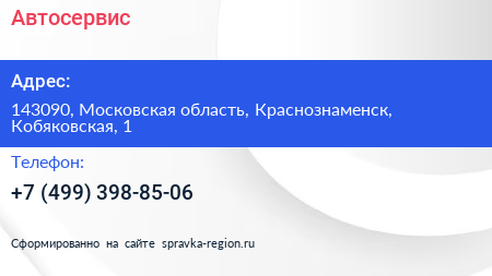 Автосервис по адресу 143090, Московская область, Краснознаменск, Кобяковская, 1 в дальнейшем Организация, размещена в следующих категориях: