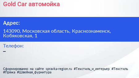 Gold Car, автомойка по адресу 143090, Московская область, Краснознаменск, Кобяковская, 1 в дальнейшем Организация, размещена в следующих категориях: