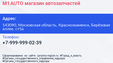M1-AUTO, магазин автозапчастей по адресу 143090, Московская область, Краснознаменск, Берёзовая аллея, ст5а в дальнейшем Организация, размещена в следующих категориях: