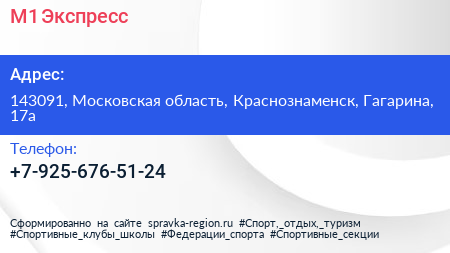 М1-Экспресс по адресу 143091, Московская область, Краснознаменск, Гагарина, 17а в дальнейшем Организация, размещена в следующих категориях: