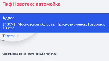 Пкф Новотекс, автомойка по адресу 143091, Московская область, Краснознаменск, Гагарина, 10 ст2 в дальнейшем Организация, размещена в следующих категориях: