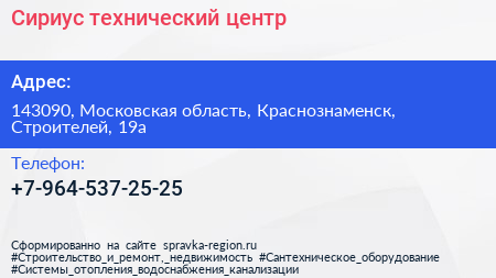 Сириус, технический центр по адресу 143090, Московская область, Краснознаменск, Строителей, 19а в дальнейшем Организация, размещена в следующих категориях: