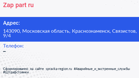 Zap-part.ru по адресу 143090, Московская область, Краснознаменск, Связистов, 9/4 в дальнейшем Организация, размещена в следующих категориях: