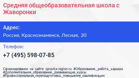 Средняя общеобразовательная школа, с. Жаворонки по адресу МБОУ Жаворонковская средняя общеобразовательная школа, Лесная улица, Жаворонки, Одинцовский городской округ, Московская область, Центральный федеральный округ, 143020, Россия в дальнейшем Организация, размещена в следующих категориях:
