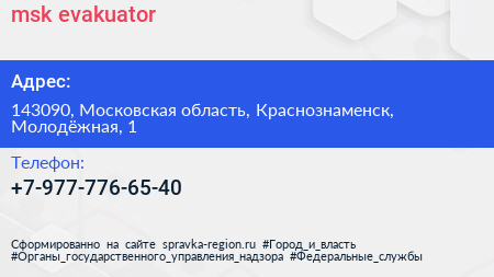 msk-evakuator по адресу 143090, Московская область, Краснознаменск, Молодёжная, 1 в дальнейшем Организация, размещена в следующих категориях: