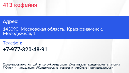413, кофейня по адресу 143090, Московская область, Краснознаменск, Молодёжная, 1 в дальнейшем Организация, размещена в следующих категориях: