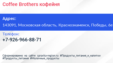 Coffee Brothers, кофейня по адресу 143091, Московская область, Краснознаменск, Победы, 6е в дальнейшем Организация, размещена в следующих категориях: