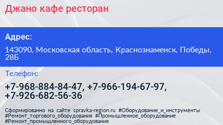 Джано, кафе-ресторан по адресу 143090, Московская область, Краснознаменск, Победы, 28Б в дальнейшем Организация, размещена в следующих категориях: