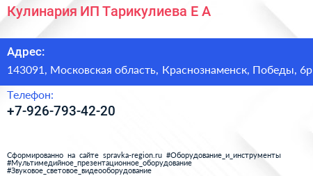 Кулинария, ИП Тарикулиева Е.А. по адресу 143091, Московская область, Краснознаменск, Победы, 6р в дальнейшем Организация, размещена в следующих категориях: