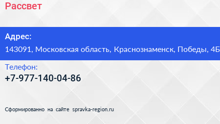 Рассвет по адресу 143091, Московская область, Краснознаменск, Победы, 4Б в дальнейшем Организация, размещена в следующих категориях: