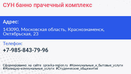 СУН, банно-прачечный комплекс по адресу 143090, Московская область, Краснознаменск, Октябрьская, 23 в дальнейшем Организация, размещена в следующих категориях: