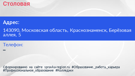 Столовая по адресу 143090, Московская область, Краснознаменск, Берёзовая аллея, 5 в дальнейшем Организация, размещена в следующих категориях: