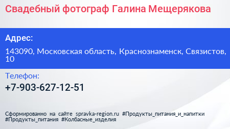 Свадебный фотограф Галина Мещерякова по адресу 143090, Московская область, Краснознаменск, Связистов, 10 в дальнейшем Организация, размещена в следующих категориях: