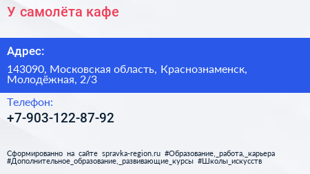 У самолёта, кафе по адресу 143090, Московская область, Краснознаменск, Молодёжная, 2/3 в дальнейшем Организация, размещена в следующих категориях:
