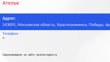Ателье по адресу 143091, Московская область, Краснознаменск, Победы, 6р в дальнейшем Организация, размещена в следующих категориях: