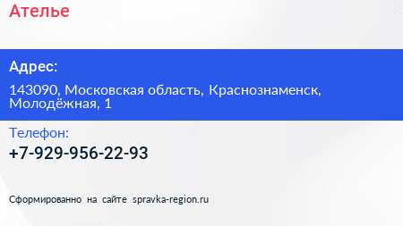 Ателье по адресу 143090, Московская область, Краснознаменск, Молодёжная, 1 в дальнейшем Организация, размещена в следующих категориях: