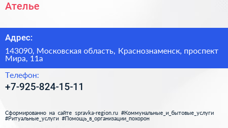 Ателье по адресу 143090, Московская область, Краснознаменск, проспект Мира, 11а в дальнейшем Организация, размещена в следующих категориях: